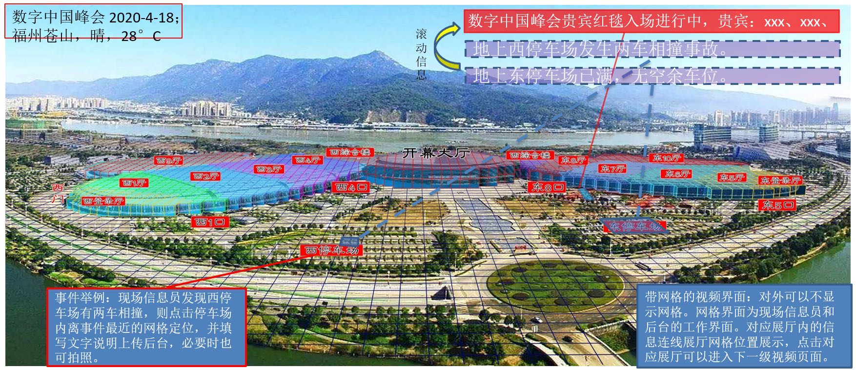 通過給福州倉山海峽會展中心安裝多個高位攝像頭,利用北斗網格編碼和三維網格立體建模技術,實現視頻內容空間感知、快速定位、高效管理、多源數據協同分析能力的視頻網格化管理系統,滿足跨鏡頭跟蹤、人群趨勢分析等應用需求,從而快速、高效地實現會展中心視頻監(jiān)控智能管理、重點區(qū)域安全態(tài)勢感知及實時指揮,提升會展中心安防管控能力和應急事件響應能力。